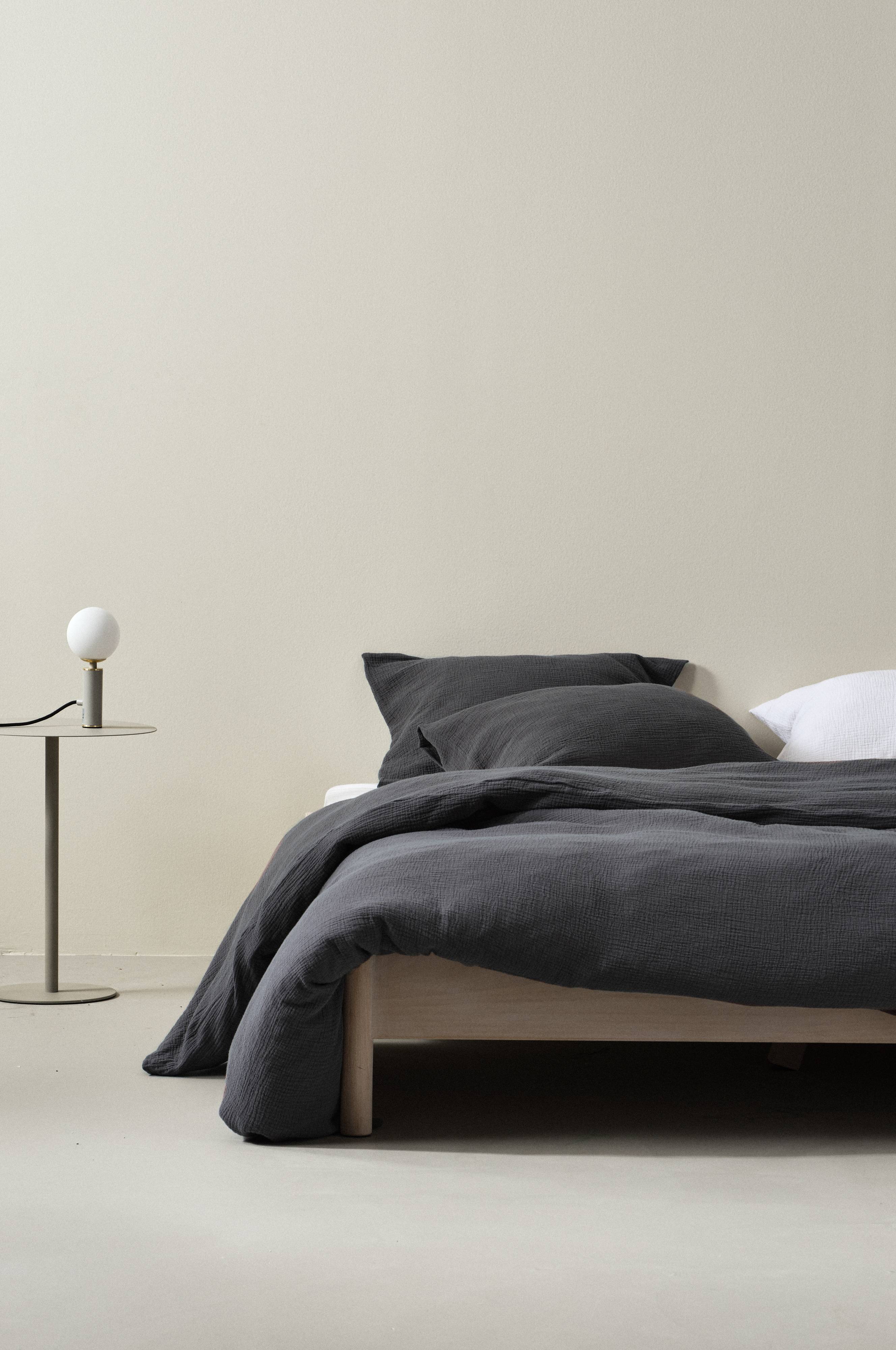 Ensfarget sengesett med et ekstra bredt dynetrekk og to putevar, i herlig, økologisk bomullsmusselin. Musselin er et mykt, tynt stoff i to lag, vevd med litt boblete effekt, noe som gjør stoffet mykt og ekstra lettstelt. Du trenger hverken stryke eller mangle. Det er dessuten vasket for en mykere følelse og for å få frem den boblete teksturen. Det behagelige musselinstoffet er deilig å sove i. Åpning øverst i hjørnene på dynetrekket. Det gjør det lettere å tre dynetrekket over dynen. Trådtetthet på 178 tc. (Trådtettheten forteller om antallet tråder, thread counts, pr. kvadrattomme i et stoff. Jo høyere trådtetthet, desto høyere kvalitet.)