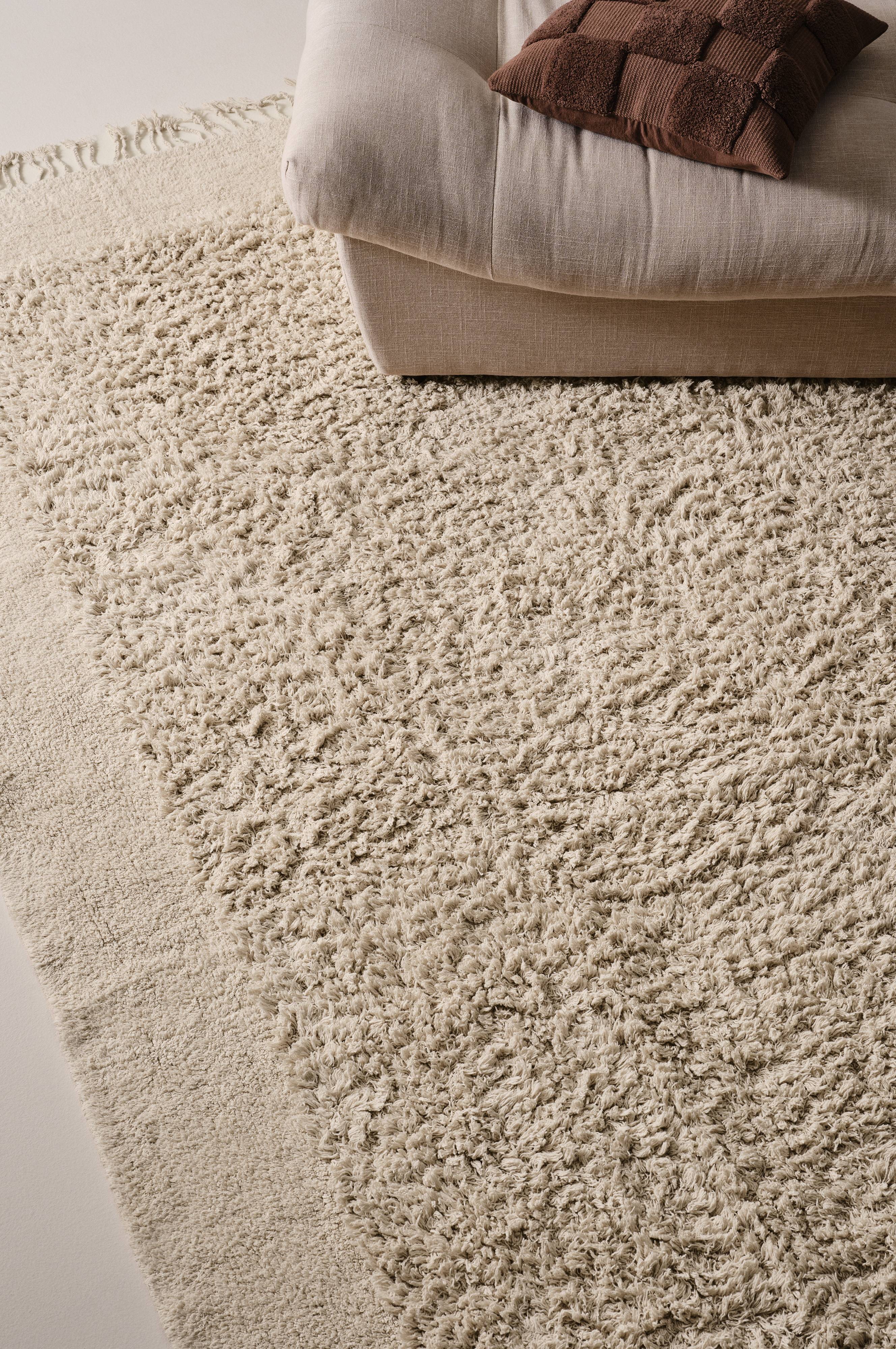 ElpyTuftet teppe av bomull med fint flettede frynser. Det myke, herlige teppet er ensfarget og har lang lugg i midten. Borden rundt har kortere lugg. Frynser 12 cm. Lugghøyde 1 cm og 3,5 cm. Tykkelse 3,6 cm. 1600 g/m².