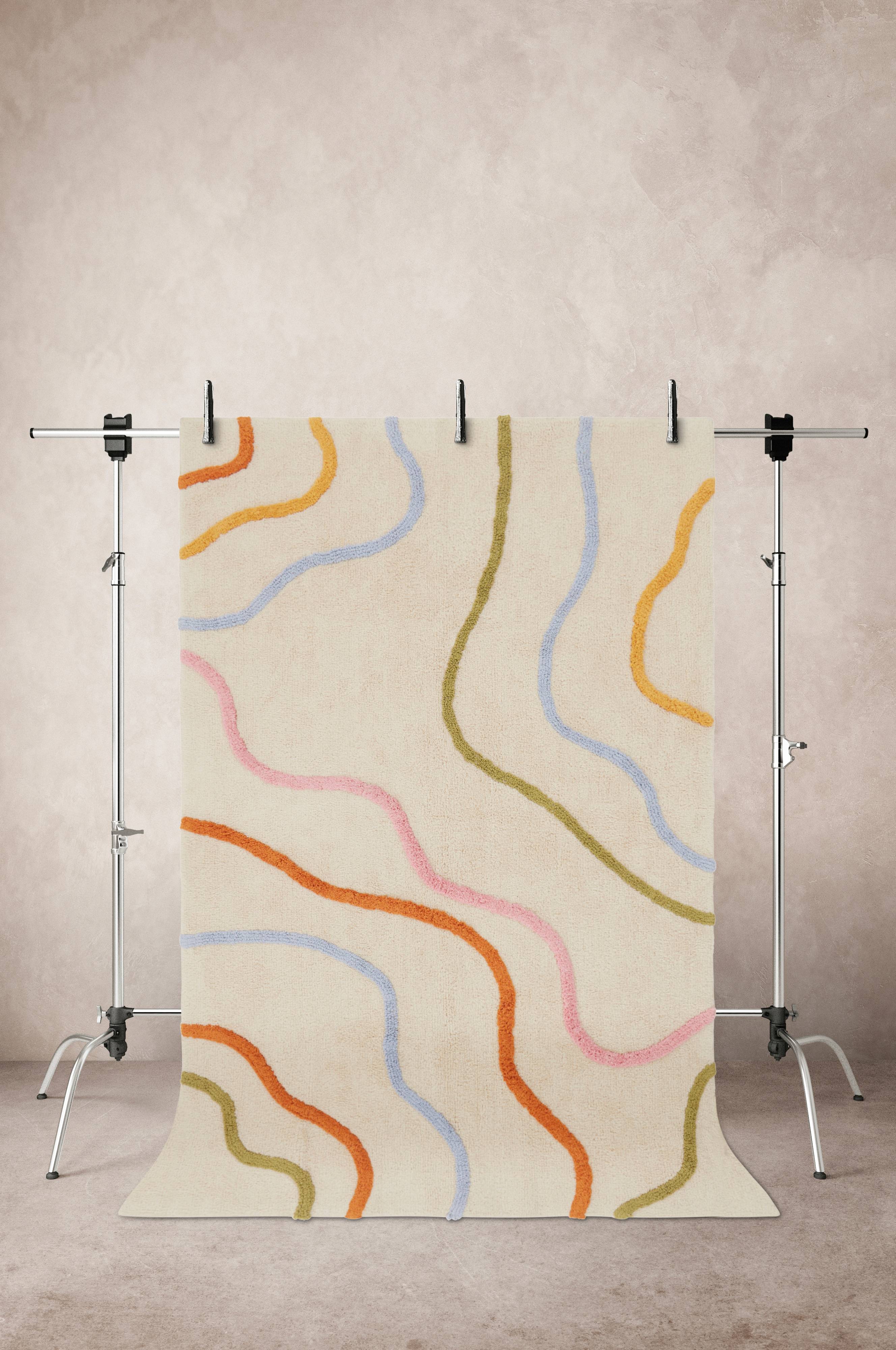 ElpyTuftet bomullsteppe med garnfarget mønster som bølger frem i klare pasteller på beige bunn. Mønsteret forsterkes av varierende lugghøyde. Teppet er mykt og herlig å sitte og leke på. Lugghøyde kort lugg 1-1,1 cm, lang 1,3-1,4 cm. Tykkelse 1,4-1,5 cm. 1700-1800 g/m².