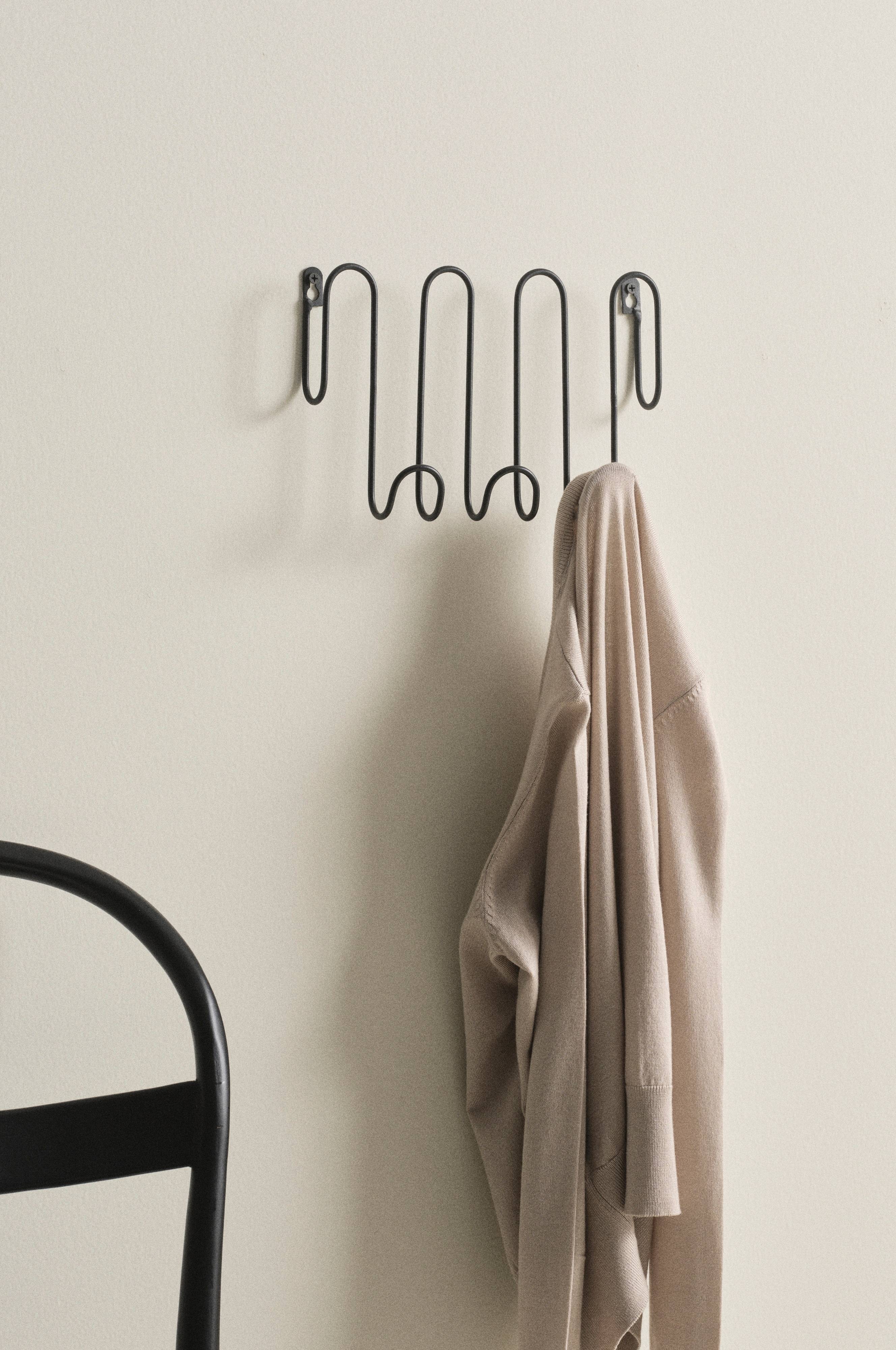 Knaggrekke av jern i morsom design, malt med oljebasert maling. Knaggrekken sitter et stykke ut fra veggen. Det gir opphengmulighet både på knaggene i nederkant og på alle buer oppover. Knaggrekken skrues fast i veggen. Skruer medfølger ikke.