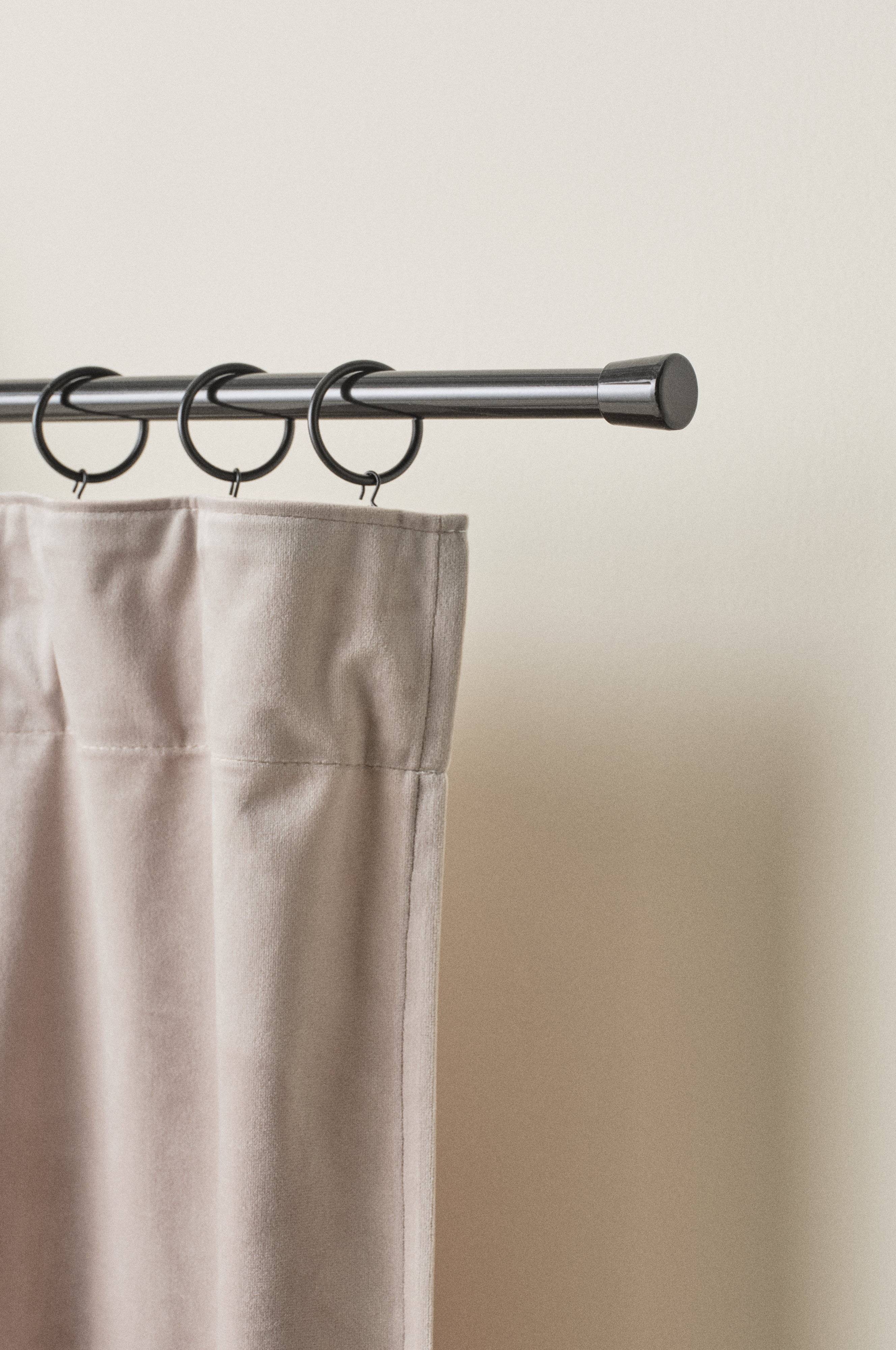 Gardinstang med stang og holdere av jern, og endedekor i formstøpt sink. Kirsch TWIGGY er et stilrent, komplett gardinstangsett med endedekor og faste holdere. TWIGGY, med sin litt nettere stang, diameter 16 cm, passer best til tynne og lette gardiner. Gardinstangens lengde er justerbar. Endeknottene trykkes på gardinstangen. Tre veggfester, skruer og plugg er inkludert. Husk at det alltid er underlaget som bestemmer hvilken type festemetode som er best egnet ved montering.