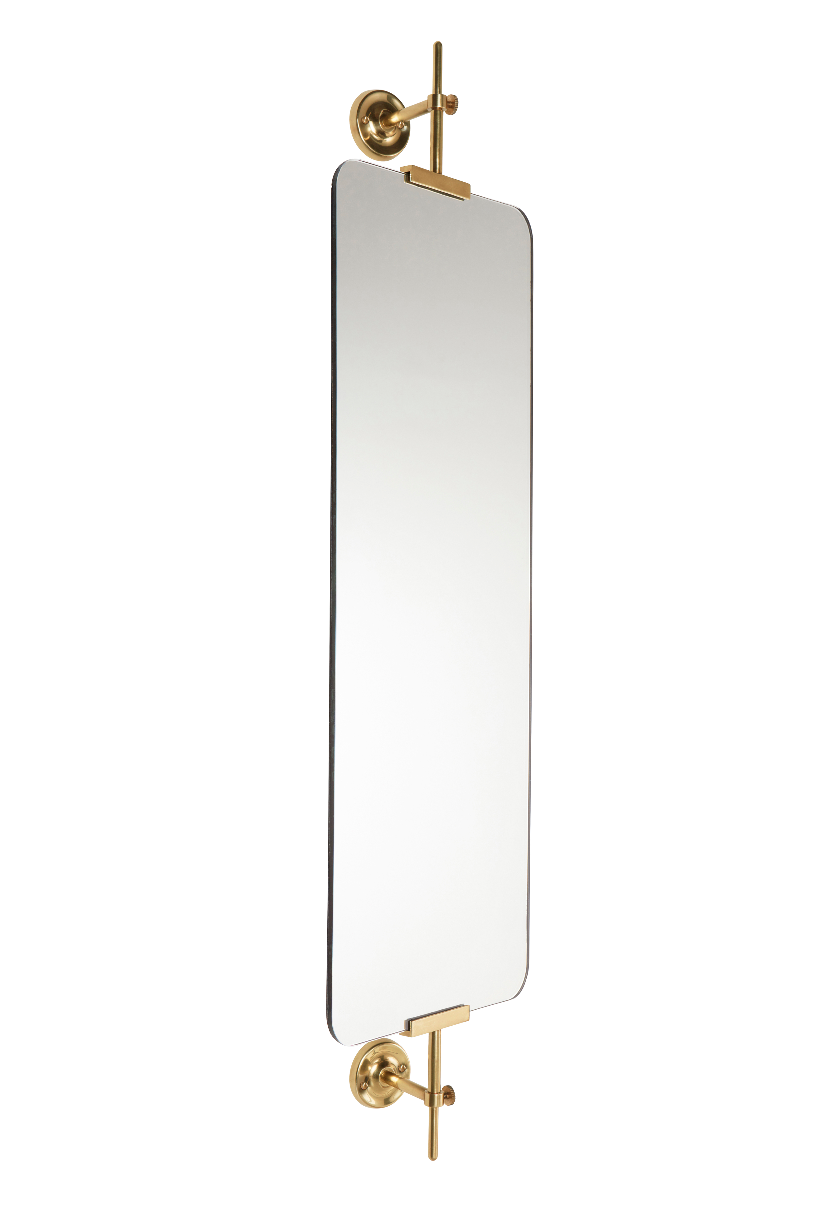 Rektangulært speil på veggfester av metall med antikkgullfarget finish. Speilet er nett helt uten ramme, og begge festene holder speilet på avstand fra veggen. Festene gjør at du kan justere speilets plassering i høydeledd. Dette speilet passer også fint på badet og i andre våtrom. Noe montering kreves. Monteringsanvisning medfølger.