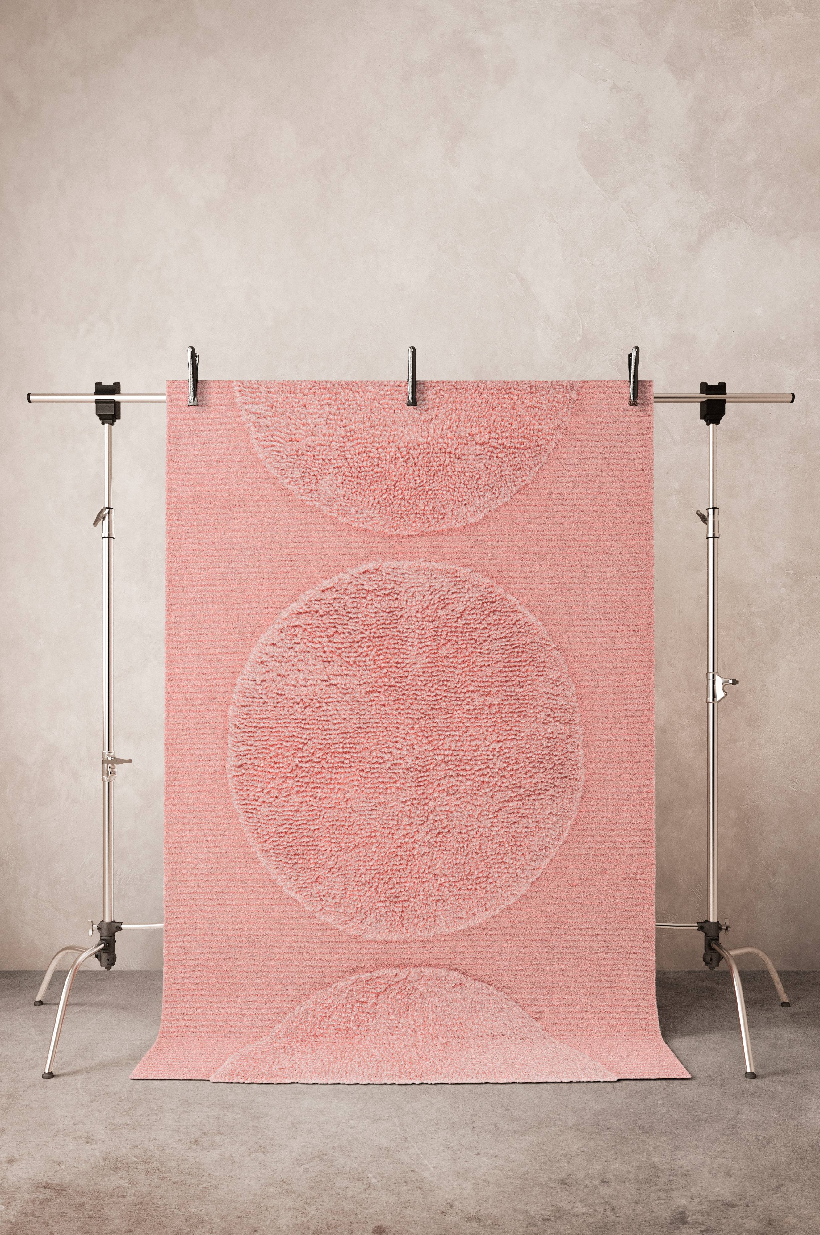 Håndtuftet ullteppe med pent relieffmønster hvor de store sirklene har lenger lugg enn resterende del av teppet. Et håndlaget teppe er et fint håndverk, og hvert teppe er unikt. Lugghøyde lav lugg 0,5-0,6 cm, høy lugg 1-1,2 cm. Tykkelse 1,8-2 cm. 4000-4200 g/m².