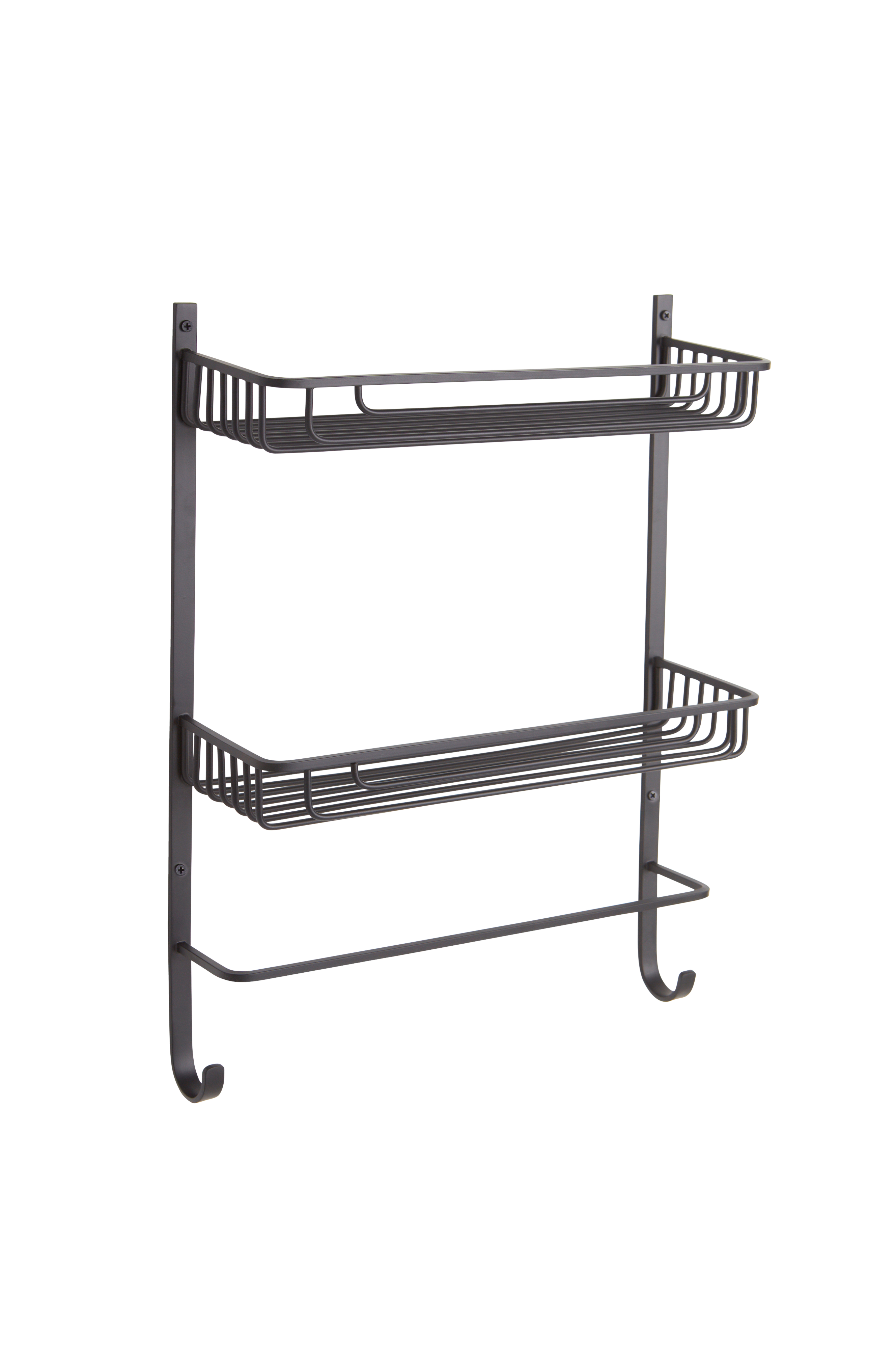 Baderomshylle av metall med håndkleholder og to kroker i nederkant. To gitterhyller med kant rundt. Hyllen gjør seg like fint ved speilet som utenfor dusjen.