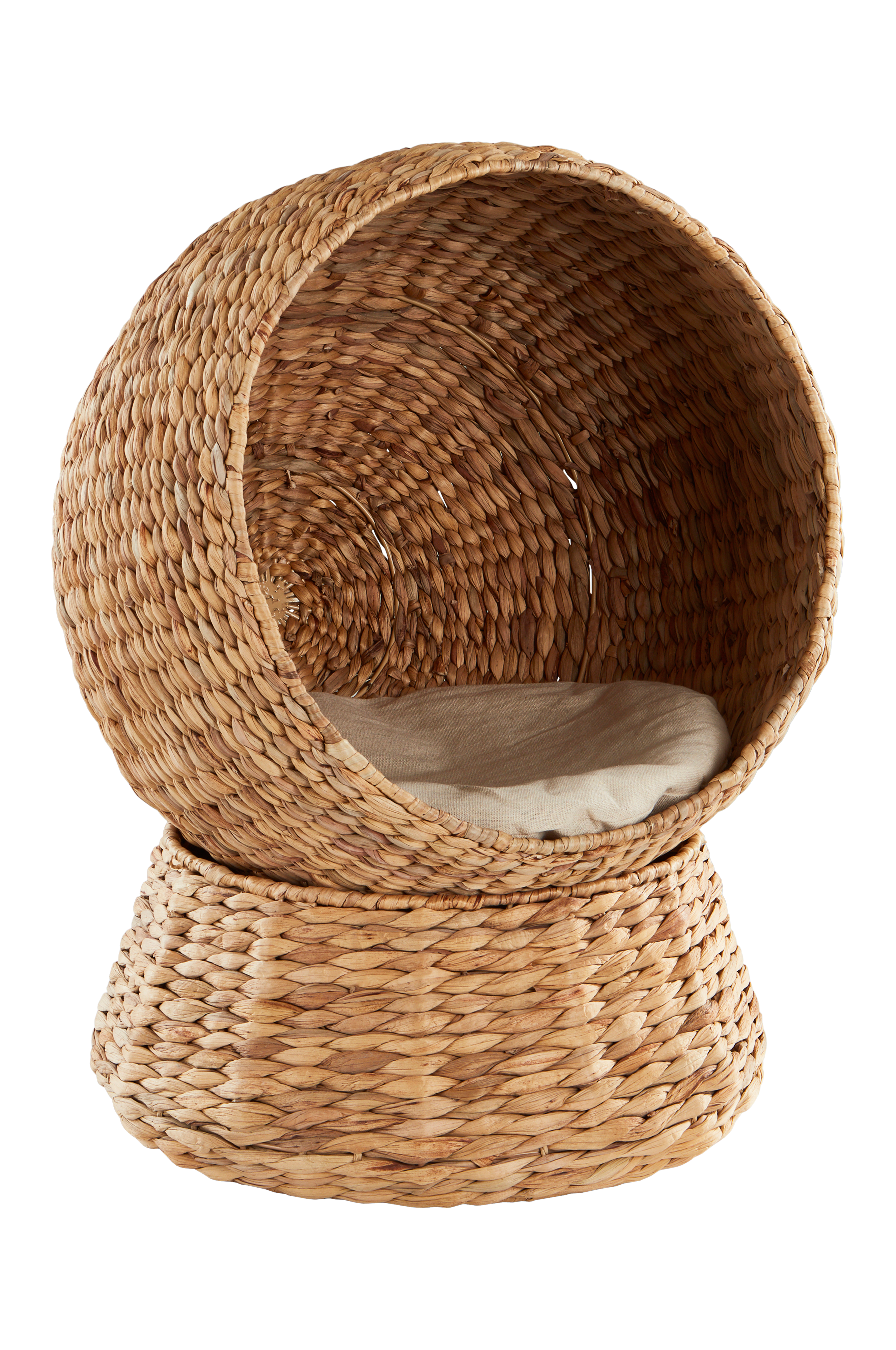 VICK er en lun og koselig hundeseng eller katteseng. Mange små hunder og mange katter liker å krype inn i en liten «hytte» hvor det blir varmt og deilig. Sengen er av vannhyasint som er flettet for hånd til en rund kurv. Kurven har en liten, løs fot slik at du kan velge om du vil bruke den eller ikke. I sengen ligger det en liten madrass av lin. Er din lille firbente venn litt frossen, er denne sengen et perfekt valg. Det fine håndverket gjør hver seng unik.
