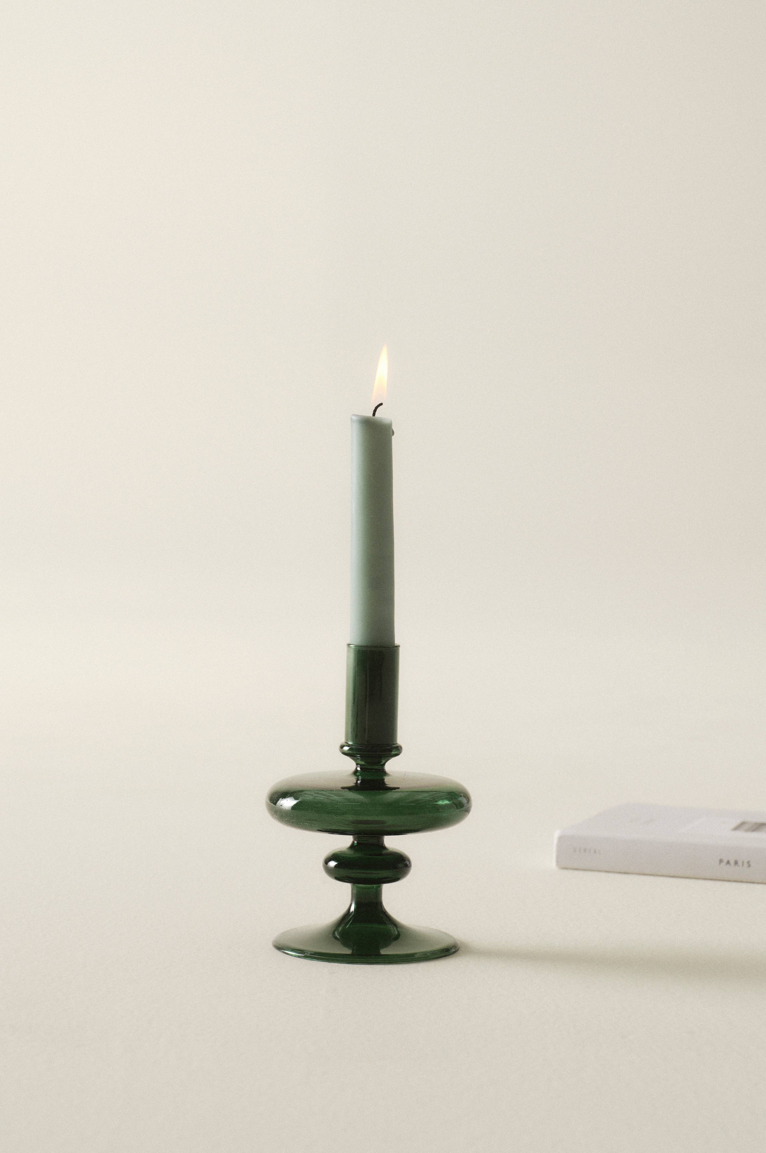 Lysestake av glass i fin, retroinspirert form. Lysestaken FLORENCE er håndlaget og kommer i vakre farger. Det fine håndverket gjør hver lysestake unik. Lys medfølger ikke.