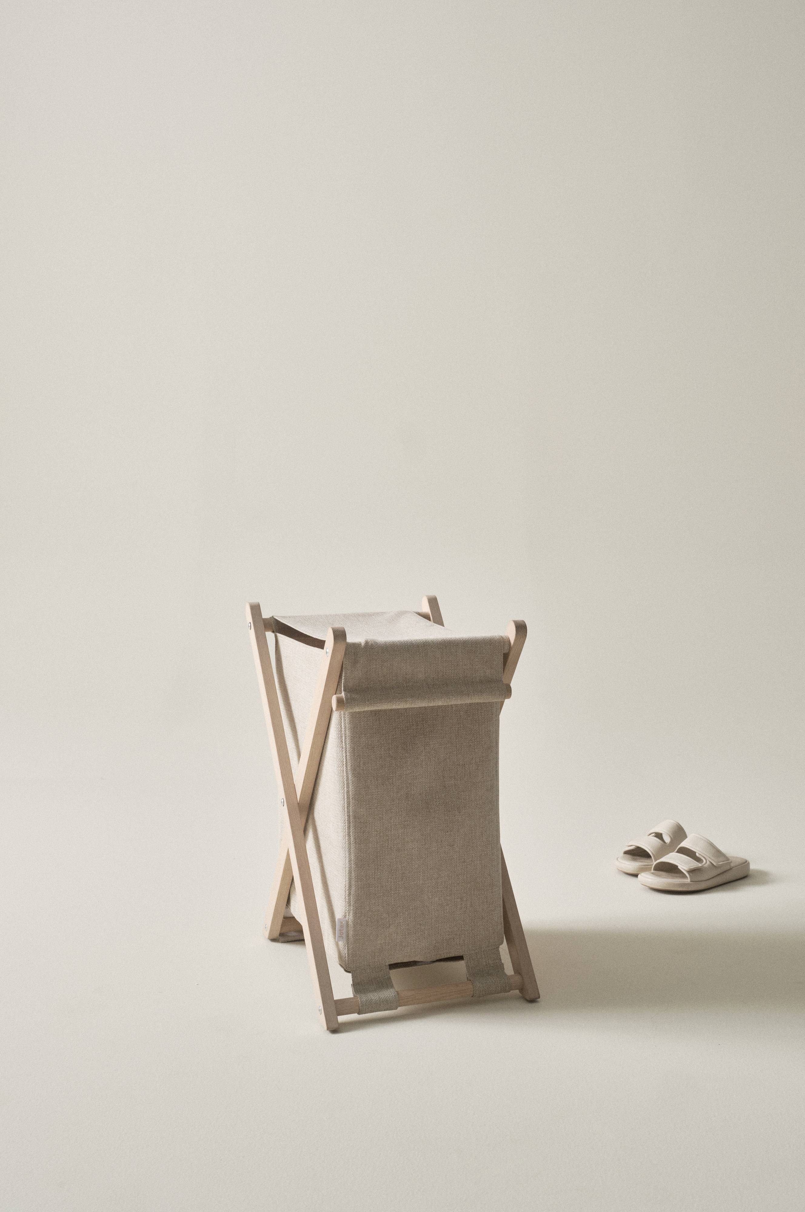 Skittentøyskurv i stilren design med influenser fra naturen og den nordiske stilen. Stamme av FSC-merket, massiv eik. Treet er behandlet med såpe slik at overflaten er myk. Stoffet i skittentøyskurven er av linfarget polyester/polyamid. Stoffposen kan tas av stativet og vaskes. Lokket av stoff er åpent langs tre sider, og er lett å åpne. Det er en praktisk løsning slik at du alltid vet hvor du har lokket, det sitter fast og er ikke i veien. En trestav i forkant gjør at det ligger på plass når skittentøyskurven er lukket. Noe montering kreves. Monteringsanvisning medfølger.