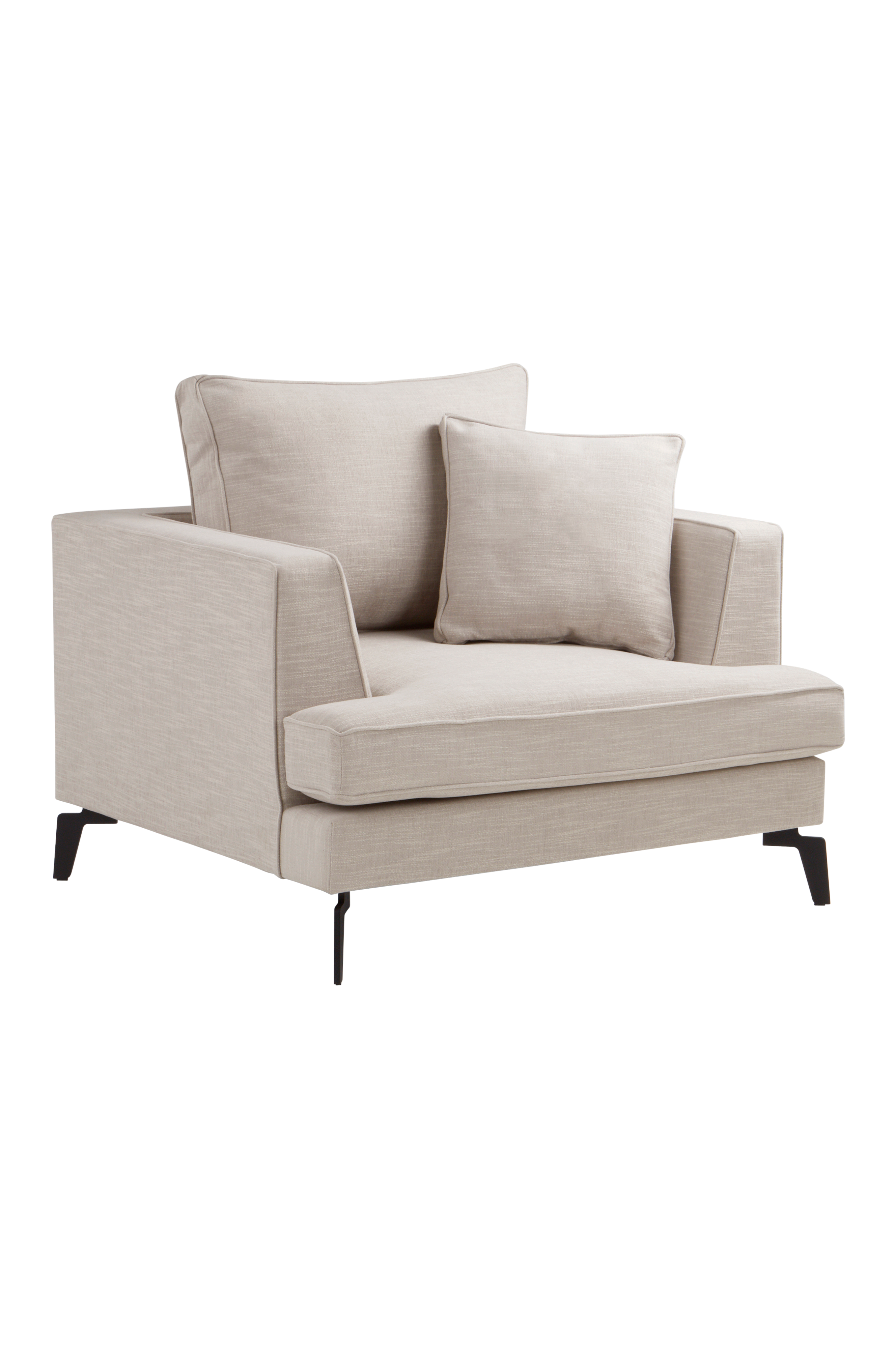 VILLACH er en innbydende lenestol som er myk i designet. En fin detalj er at alle putene har en fin piping rundt seg. Formen på bena gir også stolen karakter. Alle tredetaljer er FSC-merket. Trekket er et slitesterkt stoff av 80 % polyester og 20 % bomull med en lett struktur og en melert effekt. Stoffet har svært høy slitestyrke og tåler 100 000 Martindale. Ryggputen er løs og har en myk skumkjerne som er supplert med blåsefiber for å gjøre den myk og behagelig. Sitteputen er også avtakbar, og skumfyllet gir den god sittekomfort. En mindre pute i samme stil følger også med for ekstra komfort. Armlenene har en behagelig høyde. De velformede, utsvungne metallbeina har en pulverlakkert overflate. Rammen er laget av kryssfiner. Lenestolen passer til VILLACH-sofaen, og sammen skaper de en koselig sittegruppe.