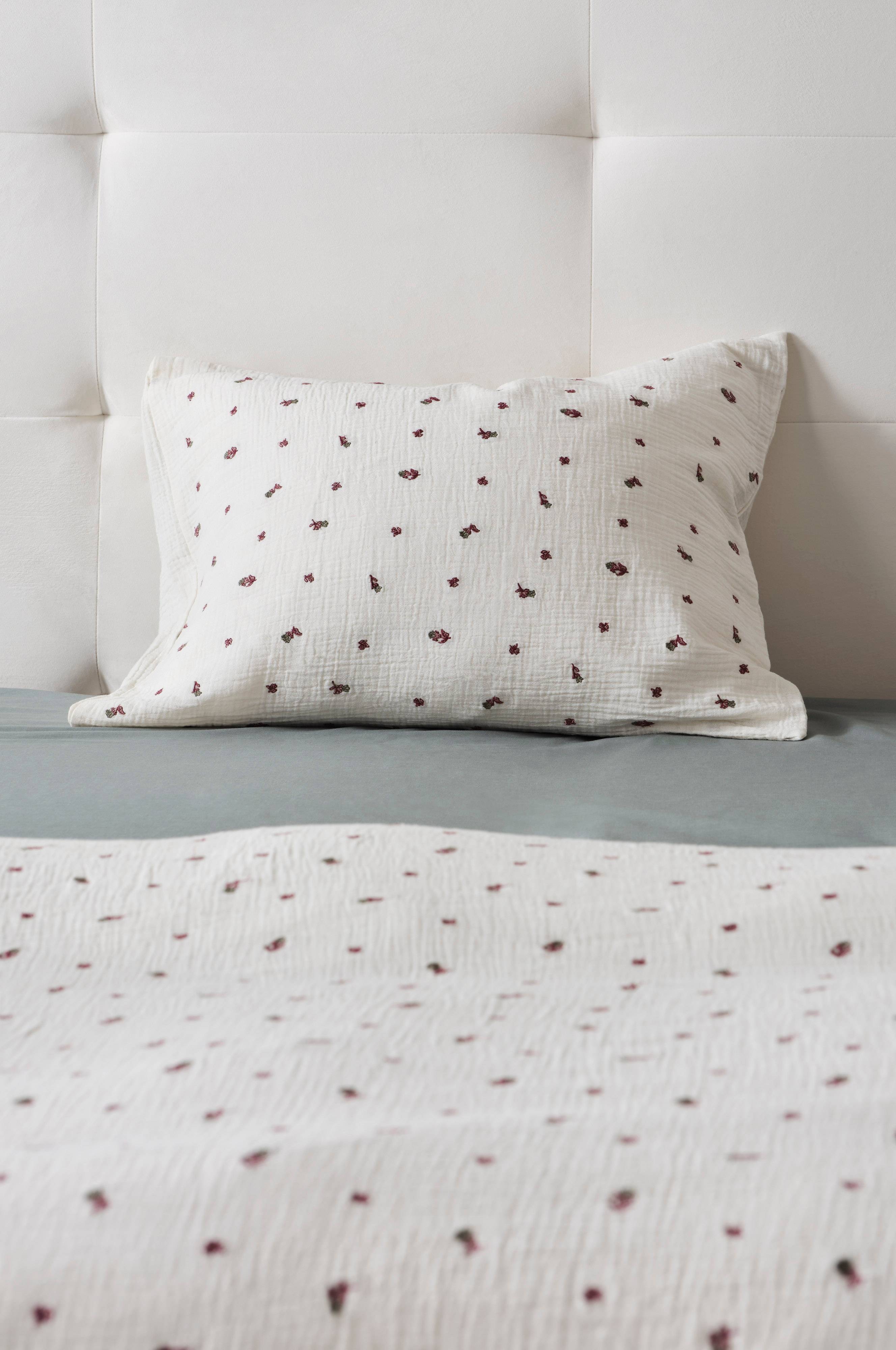 1-pk putevar i herlig bomullsmusselin med søte små broderte blomster. Musselin er et mykt stoff, vevd med boblete effekt som gjør stoffet mykt og ekstra lettstelt. Du trenger hverken stryke eller mangle. Det behagelige musselinstoffet er deilig å sove i. Trådtetthet på 178 tc. (Trådtettheten forteller om antallet tråder, thread counts, pr. kvadrattomme i et stoff. Jo høyere trådtetthet, desto høyere kvalitet.)