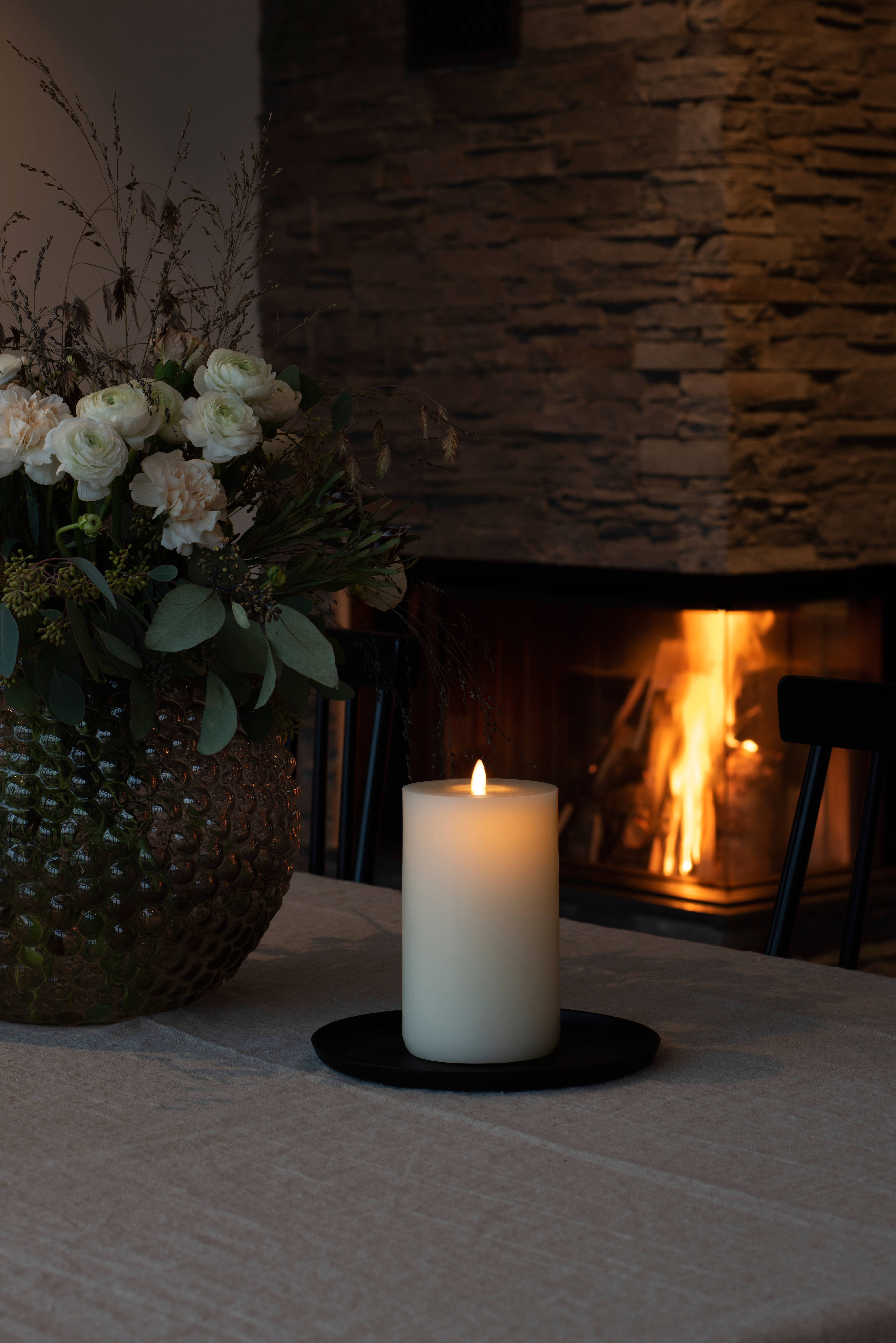 LED-vokslyset dufter av vanilje og honning og skaper en varm atmosfære med den bevegelige flammen. Lyset har en unik utblåsingsfunksjon eller berøring på toppen for enkel av/på, batteridrift og en innebygd timer for enkel kontroll.