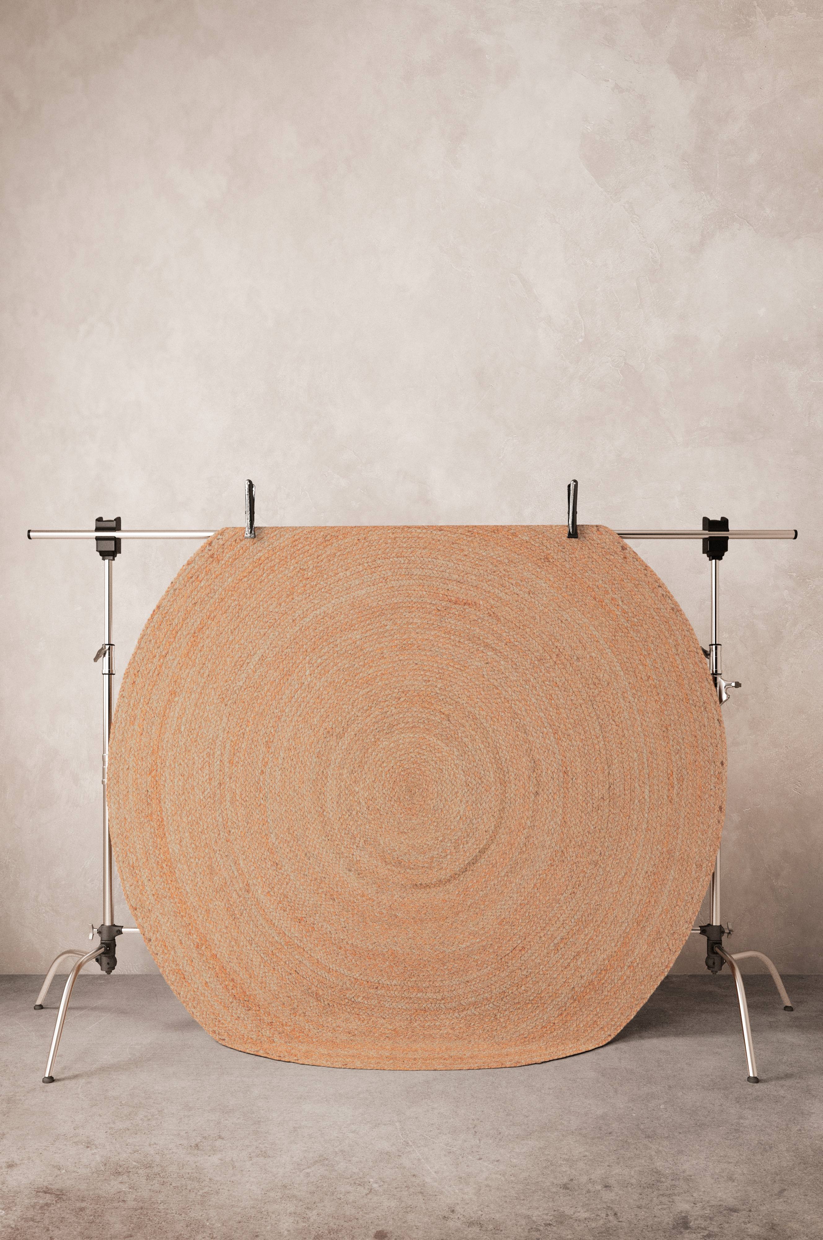 Flettet juteteppe som er håndsydd med rund fasong. Det er i fin kvalitet, og gir et naturlig inntrykk. 2200 g/m².