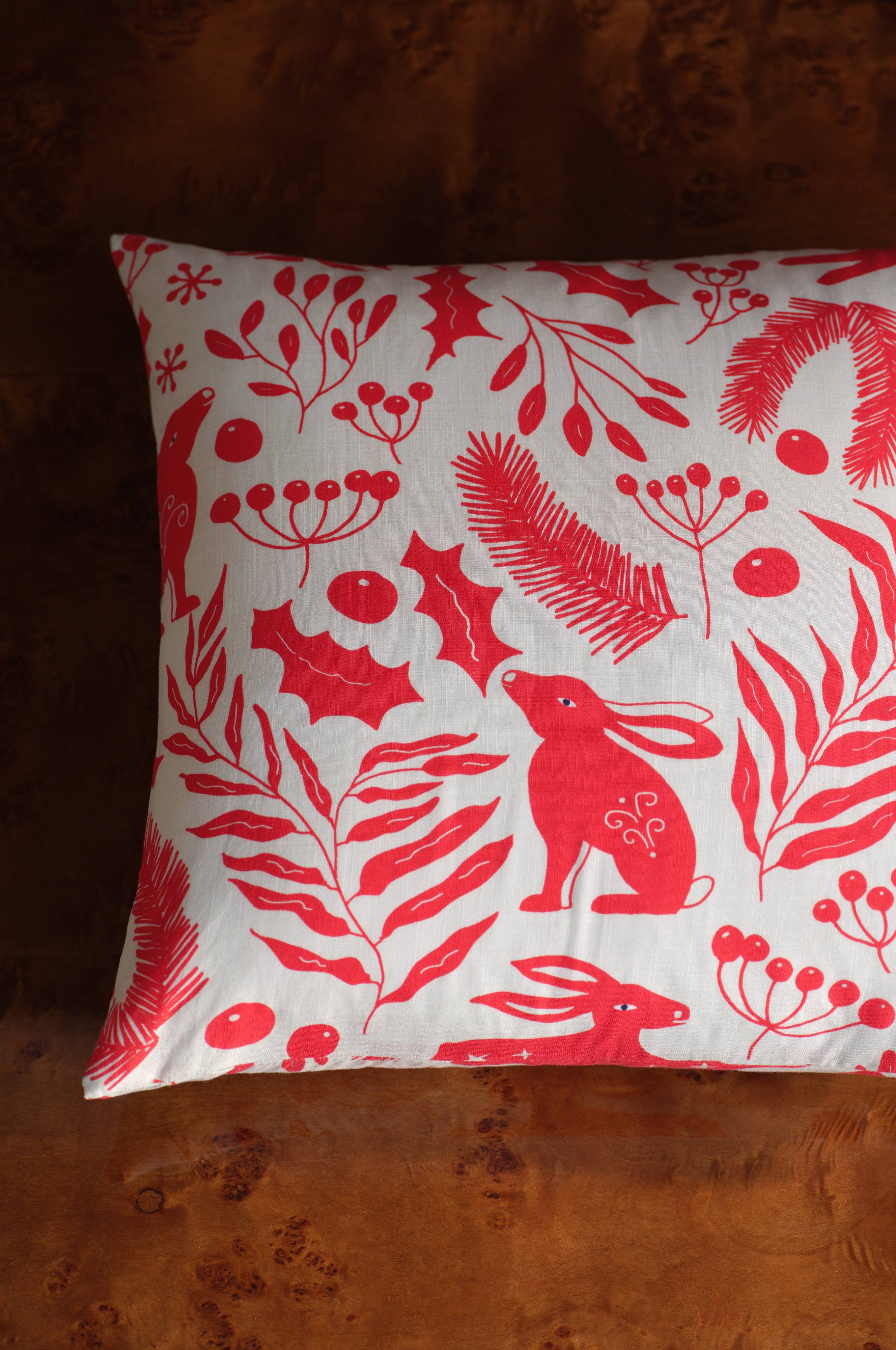 WONDERWORLD-putevaretrekket gir hjemmet ditt et klassisk juletouch. Trekket er laget av bomull og har et sjarmerende digitaltrykk med juleelementer som kristtorn og en kanin, noe som gir en leken og koselig stemning i ethvert rom.