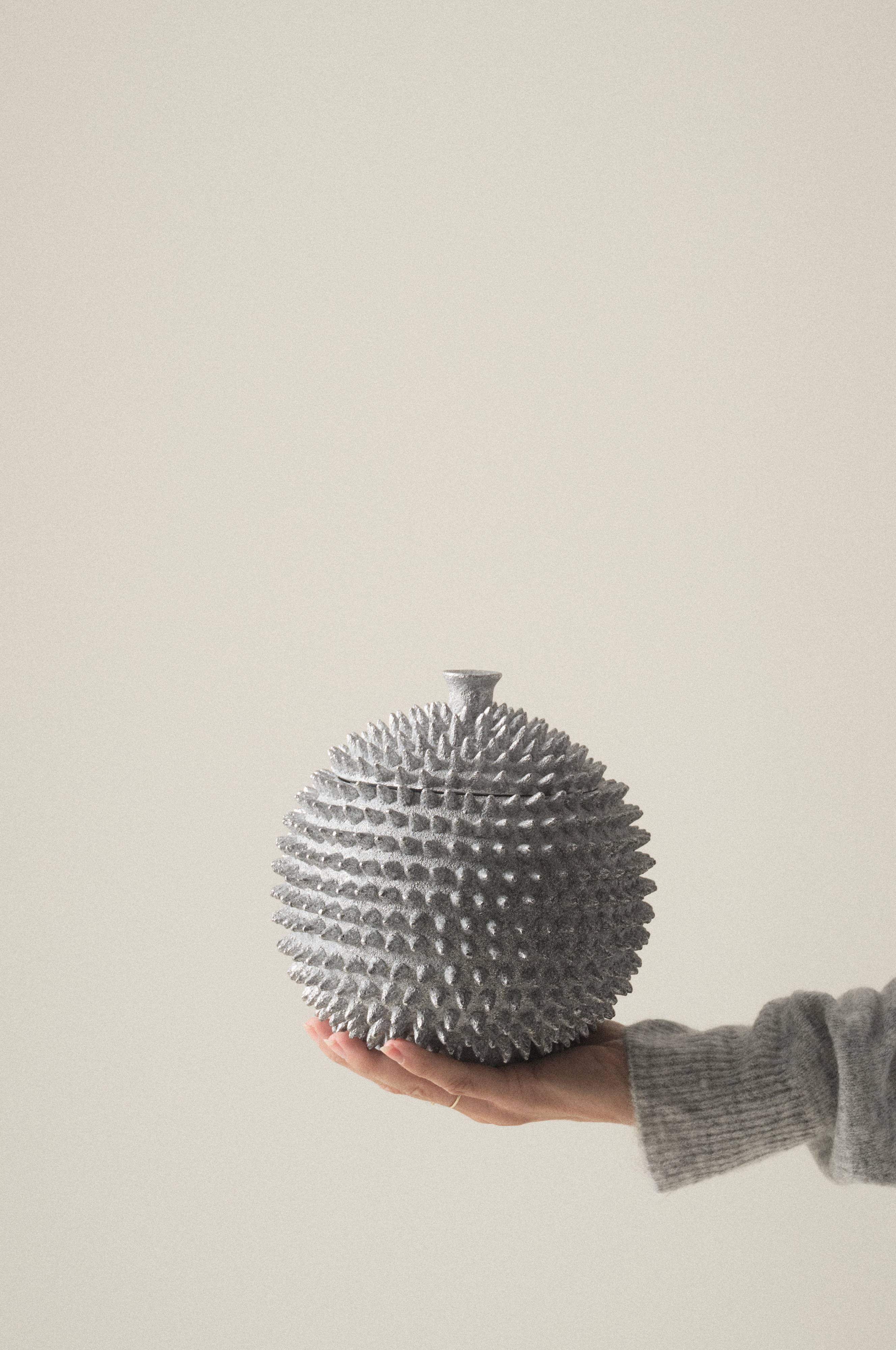Rund krukke med lokk. YAVA er av polyresin. Oppbevar småting i en taggete oppbevaringskrukke med lokk som samtidig blir en effektfull interiørdetalj i hjemmet ditt. Den nysgjerrige kan ikke holde seg unna. YAVAs overflate er lett kornete.
