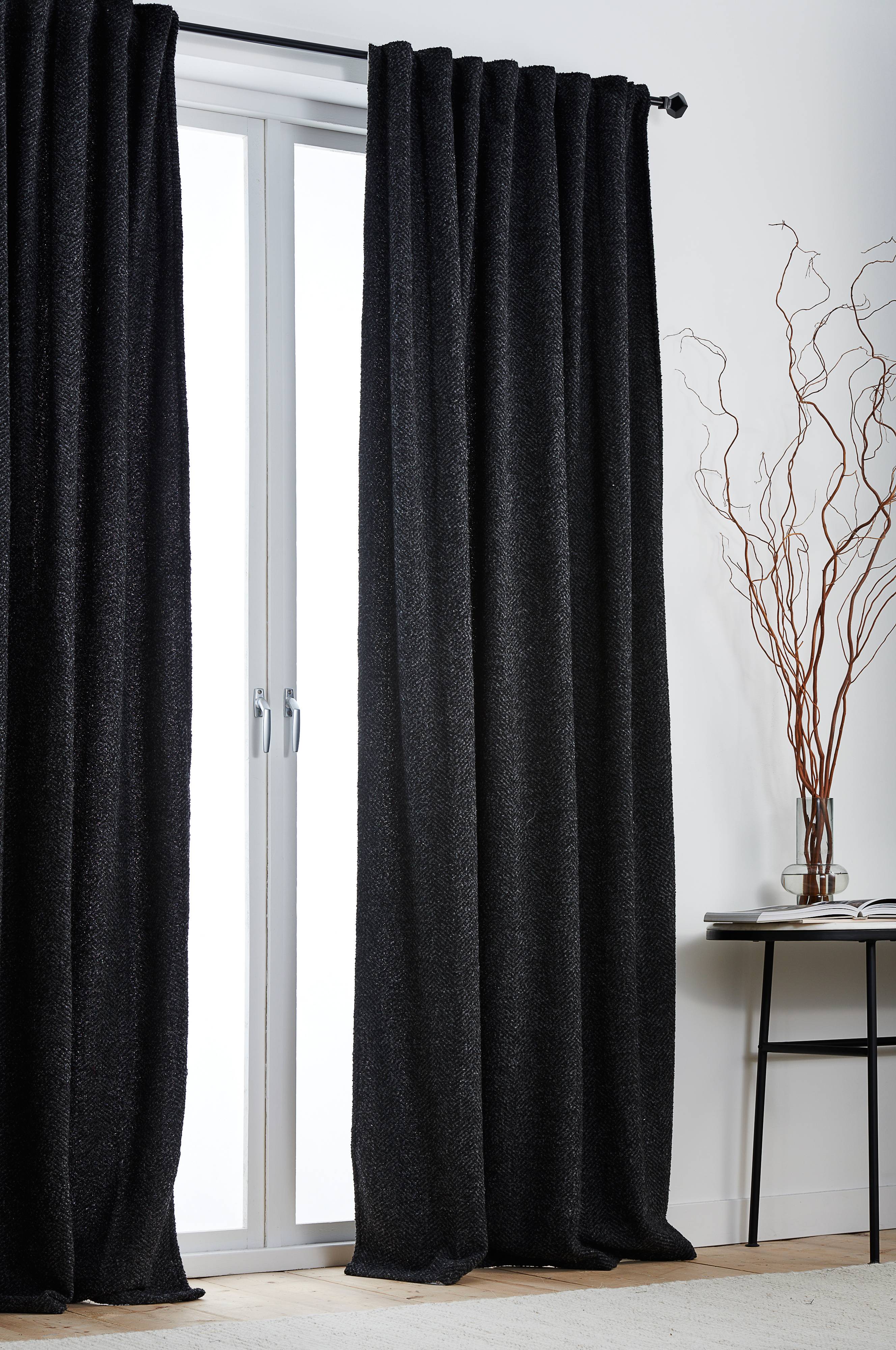 Gardinlengde av myk ullblanding med fint mønster og påsydd multifunksjonsbånd. Gardinen kan henges opp med fingerkroker, kanal samt skjult hempe.