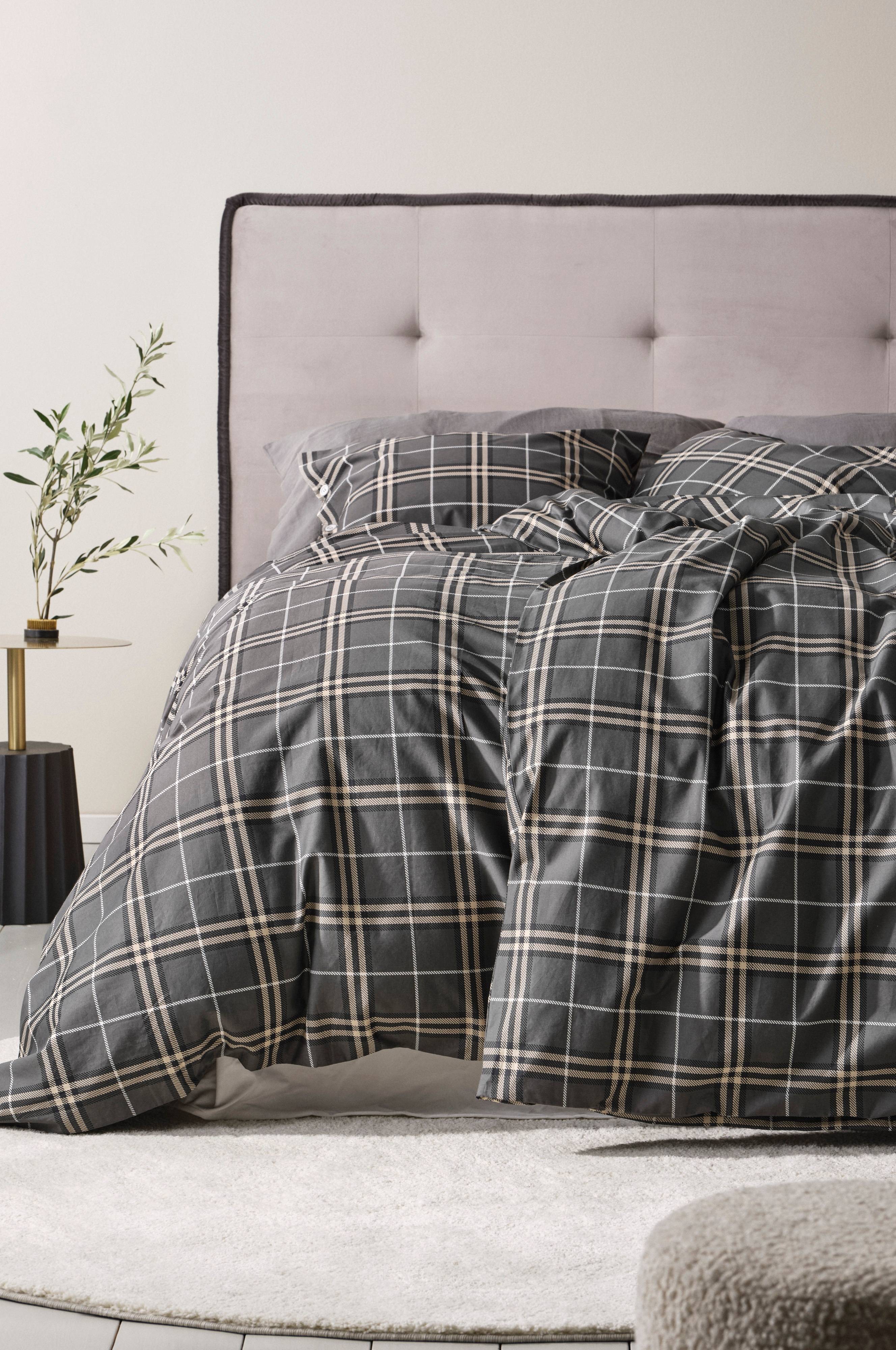 Dynetrekk i behagelig bomullssatin med et tidløst rutemønster i klassiske, sobre farger. Satin er en veveteknikk som gir et fantastisk glatt, mykt og smidig stoff. Bomull vevd med denne teknikken gir et stoff med fin glans og en luksuriøs følelse. Åpning i de øvre hjørnene av dynetrekket, noe som gjør det enklere å tre dynetrekket over dynen. Skjulte trykknapper i plast for lukking.