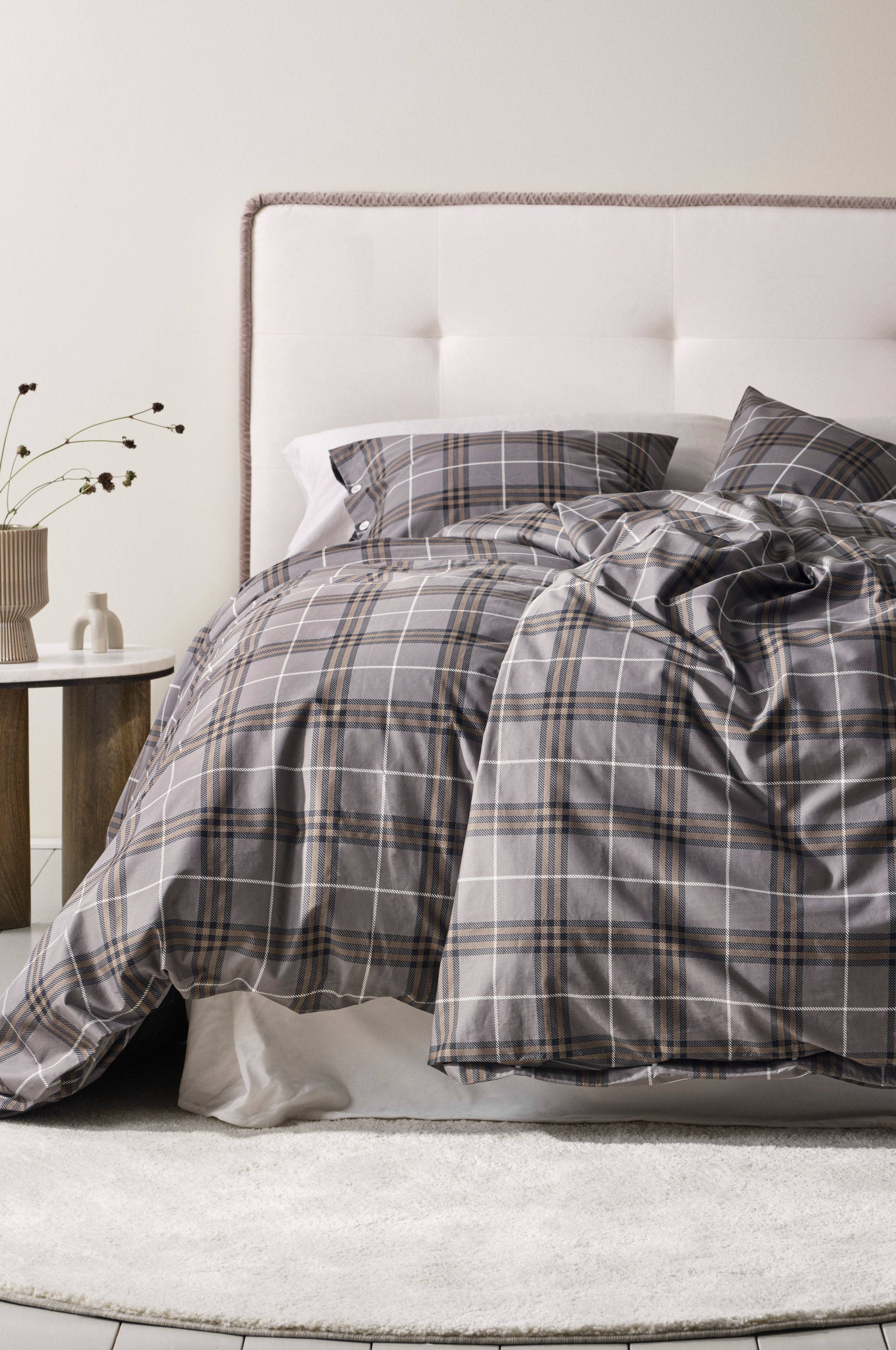 Dynetrekk i behagelig bomullssatin med et tidløst rutemønster i klassiske, sobre farger. Satin er en veveteknikk som gir et fantastisk glatt, mykt og smidig stoff. Bomull vevd med denne teknikken gir et stoff med fin glans og en luksuriøs følelse. Åpning i de øvre hjørnene av dynetrekket, noe som gjør det enklere å tre dynetrekket over dynen. Skjulte trykknapper i plast for lukking.