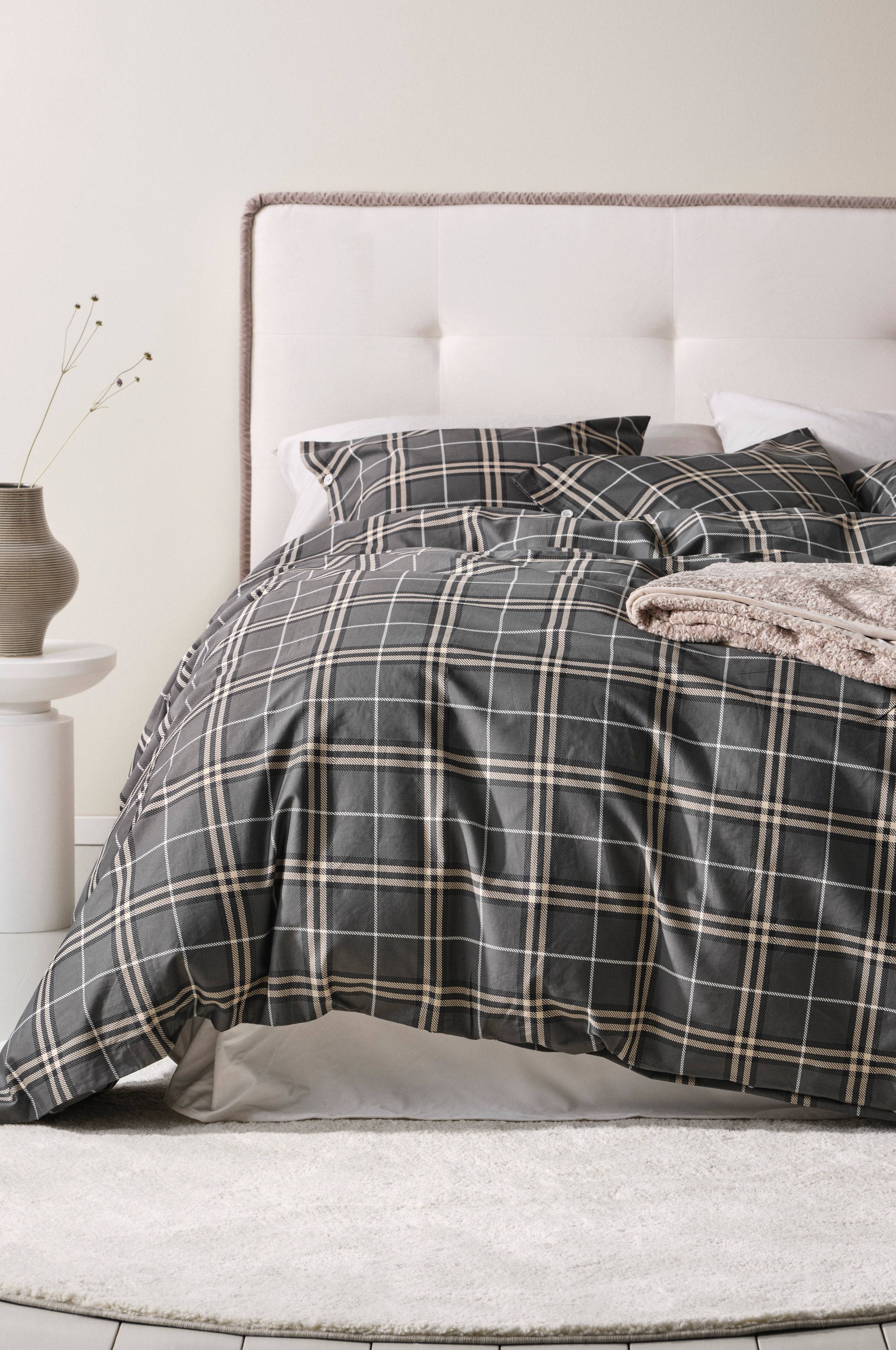 Sengesett i 3 deler av behagelig bomullssateng med tidløst rutemønster i klassisk sobre farger. Sateng er en veveteknikk som gir et herlig glatt og mykt stoff. Bomull som veves med denne teknikken blir til et stoff med fin glans og luksuriøs følelse. Åpning øverst i hjørnene på dynetrekket. Det gjør det lettere å tre dynetrekket over dynen. Skjulte trykknapper av plast for lukking av dynetrekket, putevaret har dekorative plastknapper. Trådtetthet på 120 tc. (Trådtettheten forteller om antallet tråder, thread counts, pr. kvadrattomme i et stoff. Jo høyere trådtetthet, desto høyere kvalitet.)